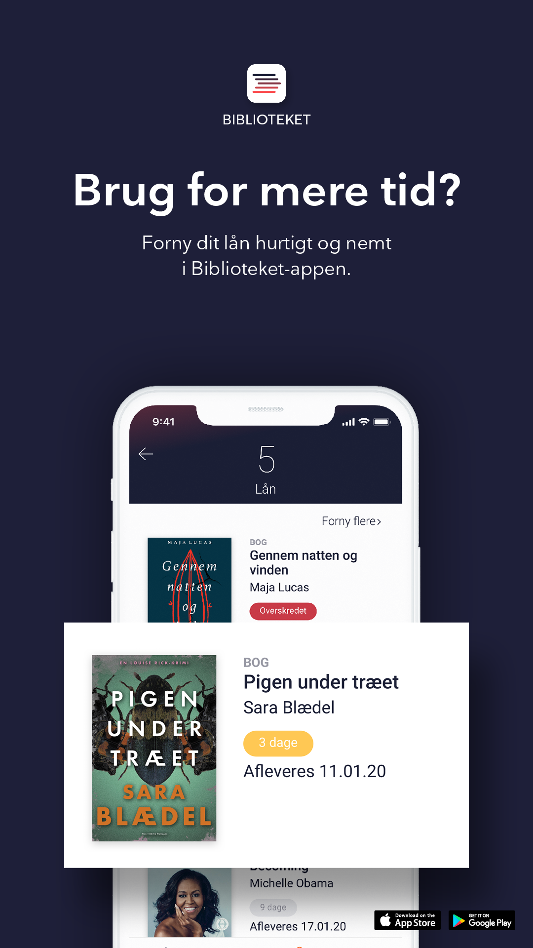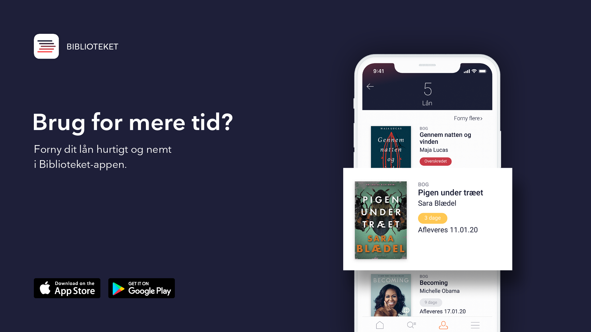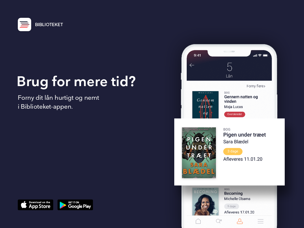 De digitale billeder fremhæver tre forskellige funktioner i Biblioteket-appen. Billederne er specielt lavet til digitale skærme rundt omkring på biblioteket og til brug på nettet.